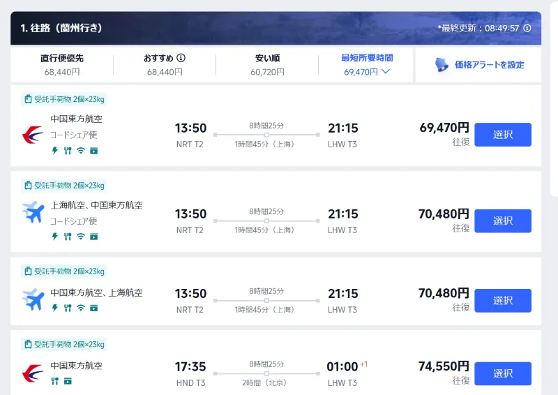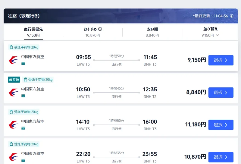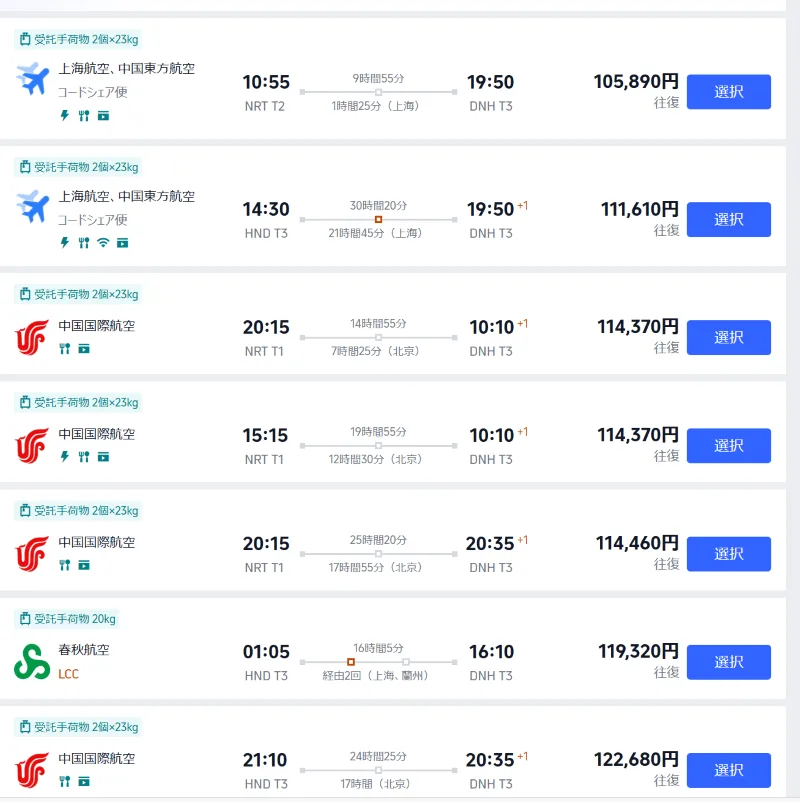 - 価格を抑えたいなら、敦煌までの乗り継ぎ国際線は買わない。