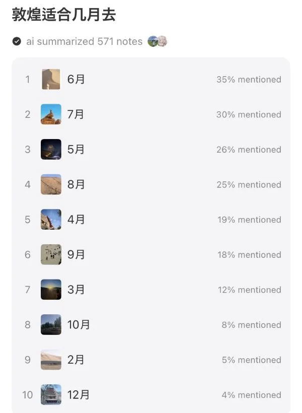 これは、中国版インスタグラムとも言える、小红书(RED NOTE)がまとめたベストシーズンのランキングです。実際に敦煌に行った旅行者が、何月をベストシーズンに選んだか?という基準で1位から10位までを算出しています。