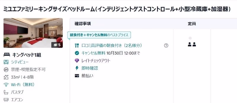 朝食付き、キャンセル無料、AIコントロール、ほんといいホテルだったよ。